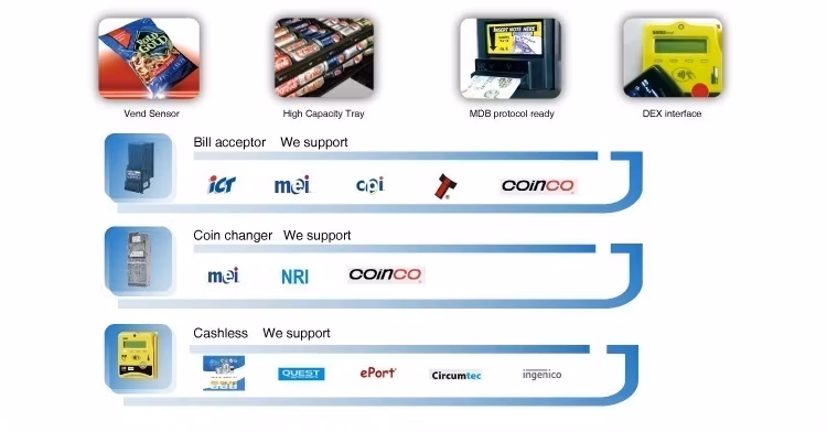 Supporto del protocollo MDB per tutti i dispositivi standard del settore, inclusi i sistemi di pagamento in contanti, monete, debito e credito