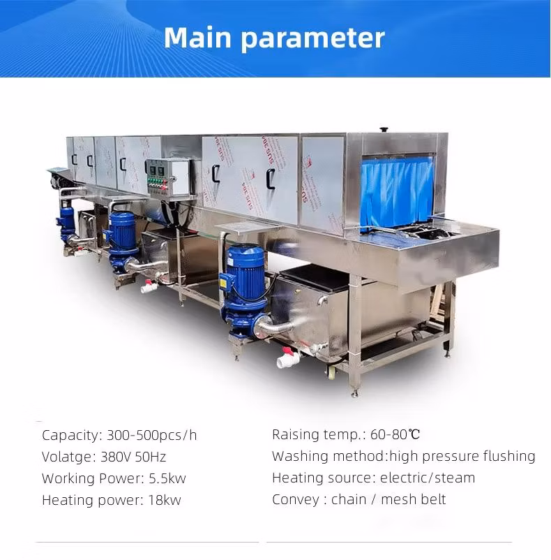 La pulizia è divisa in quattro sezioni: La prima è acqua calda alcalina, la seconda è acqua calda, la terza sezione